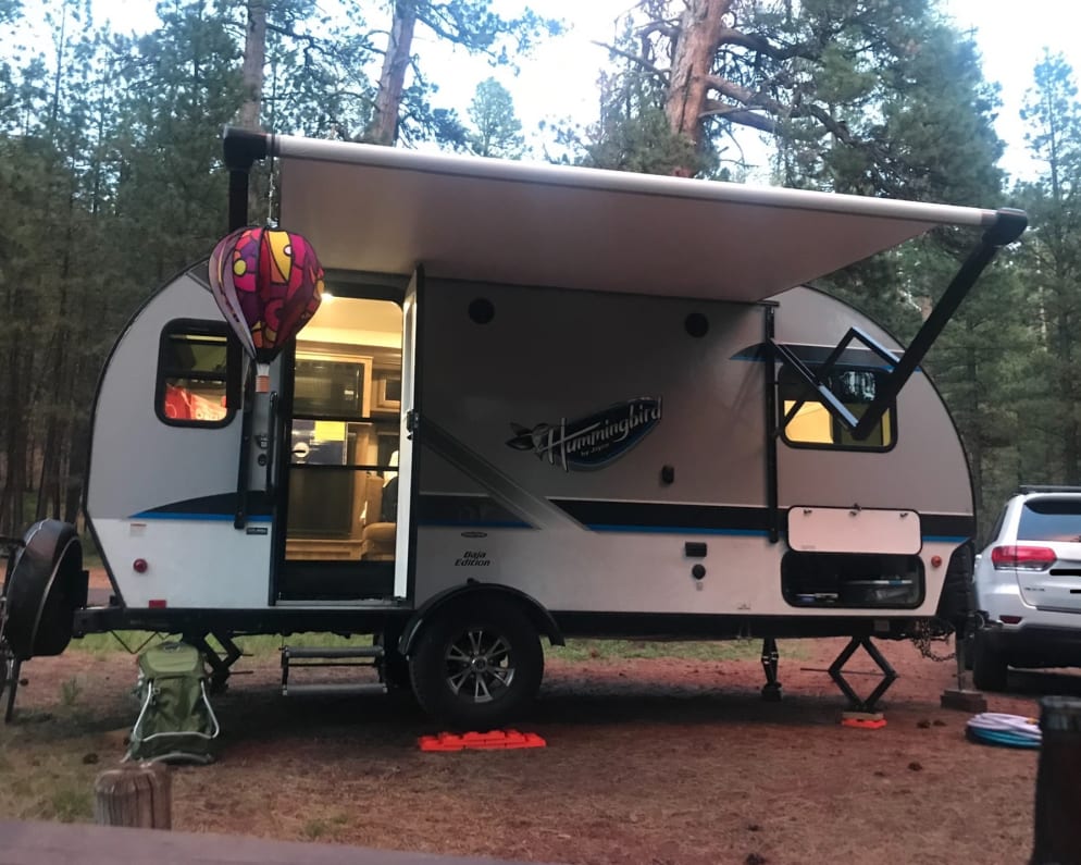 Meet Rufous- He is a young adventure seeker looking for companions. He’s at his best while parked at your favorite campground. Some of his best attributes are, wonderful rear kitchen, spacious slide out for dining, lightweight towing capacity, electric awning for sunny days and a lot of the little necessities for making camp feel like an oasis. He boasts a spacious RV queen bed, convertible dinette, toasty furnace, wonderful AC, hot water heater, refrigerator/freezer, stove, microwave, indoor and outdoor shower, tons of kitchen storage and available space for a bike rack. You’re going to love Rufous!!