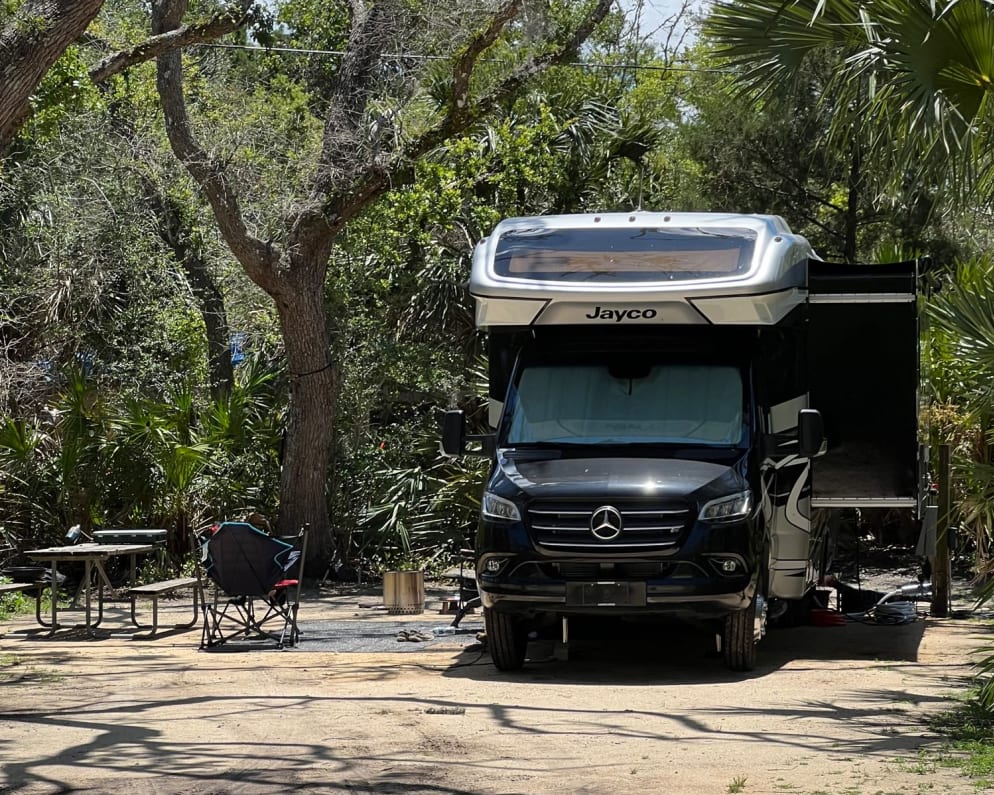 Drive with ease and camp in luxury. Mercedes chassis. Leather chairs, reverse camera, Bluetooth, CarPlay. Cozy with two recliners for a romantic movie on a rainy night. Very comfortable queen bed with comfy bedding and pillows. Extra blankets and sheets for bunk where two children or one adult can sleep comfortably. Kitchen is stocked with dishes, cooking utensils, paper towels , paper plates, paper cups, Keurig and even wine glasses! Bathroom stocked with needed toiletries. SOLO stove with cooking essentials, camp chairs, Enos, books, and two smart tvs. Outdoor speakers. String lights. Wi-Fi available. No pets. No smoking. No vaping.