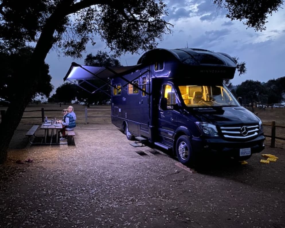 Our rare Metalic Black Winnebago View24J Class C, RV is a stunner. Easy to drive in the city or on the road at 25 feet. Mercedes-Benz Sprinter Diesel chassis, which means great gas mileage, 16 miles a gallon. We've outfitted this as our home on the road, cookware, tableware, utensils, and linens, from glamping to off the grid, you will have everything needed for the perfect RV vacation. Spacious, and comfortable. Luxury interior - this is an upscale model RV. Extra comfy seating and bedding, interior and exterior accent lighting, surround sound stereo, and two flat screens TVs. The U-shaped dinette in the 24J opens up to a large 80" sleeping space, and the cab-over bunk is perfect for kids and guests. Cab seats swivel and face the HDTV and stereo system with a CD/DVD player. T he microwave/convection oven cooks like a conventional oven in less time. A range top refrigerator with freezer complete the galley. The luxury lavatory, complete with full shower and toilet. * U-shaped dinette slideout is perfect for meals, games, and stretching out to watch television. * Solar panels for an eco-friendly charge * Quiet generator means power can run off your propane tank