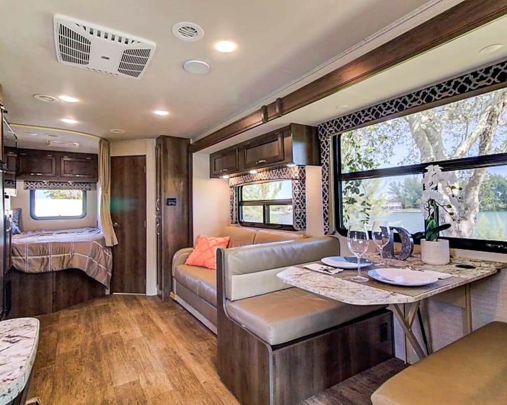 Explore the great outdoors in luxury, in this high class and modern Class C RV! This easily maneuverable RV is perfect for families who want to trek the great outdoors but still have all the comforts of home. The RV comes stocked and ready for your next camping adventure including: HDTV, plates, utensils, toilet paper, cleaning supplies, fire poker, pie iron, marshmallow sticks and much more! Book your adventure today! . Features: -Sleeps up to 7! -Easily maneuverable -Modern Design -Full bathroom with shower -Exterior and interior speakers to play your favorite tunes -HDTV w/ DVD player for those rainy days -Full size Fridge with Freezer -Stainless steel appliances -Power Awning -LED interior/exterior lighting -Comfy Queen side bed with privacy curtains -Bunkbed -Dinette converts into bed -Three-burner cooktop stove -Outdoor Kitchen! -Microwave Oven New to camping? No problem! This RV is easy to drive and can be set up and ready to go at a campsite in no time. Upon pickup I will provide a complete and detailed educational walkthrough of the camper and a driving lesson. 100 miles/night included Free! Excess mileage is $0.49/mile.