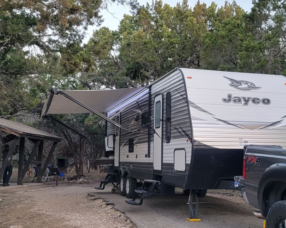 Travel trailer has a modern feel that is spacious to comfortably fit your family and friends in your home away from home. The front room has a queen-sized bed, sliding door for privacy and exterior entrance. The kitchen has lots of storage and counter space with gas oven/stove and microwave. There's a Keurig machine for your morning coffee too. The dining table sits 6 comfortably with large windows to enjoy the view while you dine. The loveseat folds out into another bed. The entertainment center has a television and blu-ray player and is viewable from the dining area and loveseat. There is plenty of storage cabinet space in the entertainment center for either the kitchen or your guests' clothes. The bathroom has lots of storage and a large shower with skylight tall enough for a tall man to stand. Under the bunkbeds is additional storage space for your camping gear. The trailer has a furnace/AC system on electric thermostat, with a pullout which makes it extra spacious for comfortable living. The outdoor kitchen has a sink, 2-burner stovetop and mini-fridge perfect for outdoor cooking. The trailer has lots of natural lighting due to the many windows. Some nearby campgrounds that we can recommend are: Jim Hogg Park and Cedar Breaks Park