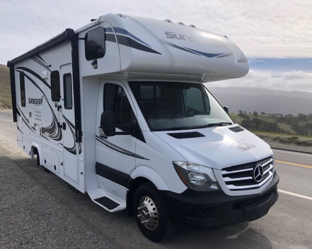 The Funseeker is a 2018 Mercedes-Benz Forest River Sunseeker 2400R. Featuring a rear slide-out containing the queen-size bed with reading lights, five windows with pull-down shades, personal closet, a TV, and a sliding wood door for privacy. A dreamy space! The Funseeker has a side slide-out, as well, containing the dinette for more floor space. Above the dinette is a storage area for your personal belongings. The dinette converts to a sleeping area that is 66” long and there are two drawers for storage below the dinette. There is a full-size bed over the cab and it contains a safety net and privacy curtains. Whip up your favorite meals in the well-equipped kitchen which contains a gas stove top, oven, microwave/convection oven, refrigerator, sink, and Keurig coffee maker. When set up to camp, the comfortable leather driver and passenger seats swivel for additional seating with a small cocktail table in between. Above the cabin door is the main TV, which is on a swivel for viewing. The bathroom contains the shower with skylight, toilet, sink with cabinet storage, and two medicine cabinets. Across from the bathroom is the closet for hanging your clothes and it contains a locking safe. In one of the four exterior storage areas, you will find the propane grill, table, rug, hammock, and 4 camp chairs to set up your outdoor space. S’mores makings included! In the other exterior storage areas, you will find bins organized with all the supplies we pro...