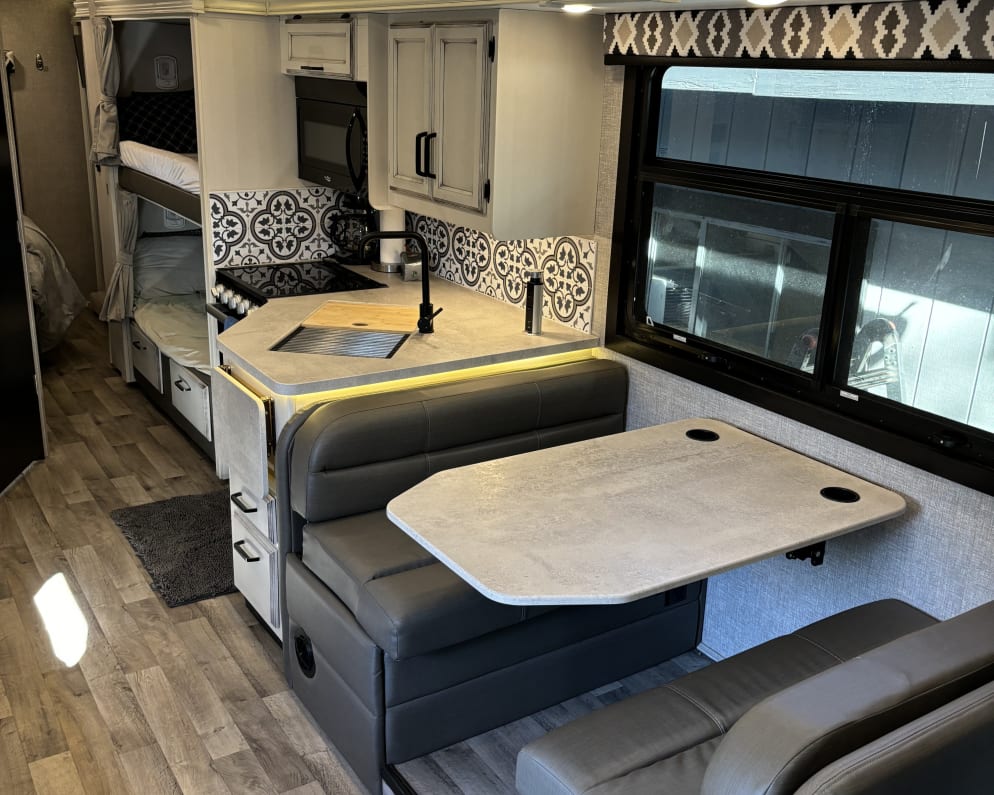 Welcome to our clean, modern, family-ready Jayco Greyhawk offering one of the most spacious and comfortable layouts in the Class C category. With bunk beds, a full-wall slide, and sleeping for up to 8, it’s perfect for family adventures, road trips, and group getaways. Inside, you’ll find a well-kept living space with attractive, easy-clean countertops, a deep stainless sink, a large pantry, and a roomy 12V refrigerator. Vinyl flooring runs throughout for easy cleaning, and recessed LED lighting gives the coach a warm, modern feel. With four TVs and DVD/Blu-ray players, everyone has entertainment options during downtime or long drives. For driving comfort and easy setup, the Greyhawk includes a hydraulic leveling system, backup and side cameras, and a smooth, stable ride. SLEEPING OPTIONS (5–8 people) ?? Private rear bedroom with walk-around queen bed ?? Large cab-over bunk (long queen) ?? Twin bunk beds (each with its own TV/DVD) ?? Sleeper dinette (fits 1 adult or 1 child) ?? Sofa bed (fits 1 adult/tween) KITCHEN AMENITIES ?? 3-burner cooktop and gas oven ?? 10 cu ft 12V refrigerator ?? Pots, pans, knives, and cooking utensils ?? Plates, bowls, cups & silverware for 6 ? Coffee maker, toaster & electric kettle ?? Attractive, easy-clean countertops ?? Deep stainless-steel sink ?? Mixing bowls & essentials included ELECTRONICS & POWER ?? LED lighting throughout ?? 32" TV in the main living area ?? 24" TV in the bedroom ?? TV/D...