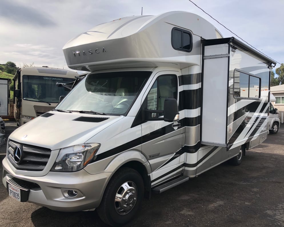 ? Mercedes Benz Sprinter Chassis ? Powered by 3.0L BlueTech Turbo Diesel ? 5 seat belts ? Sleeps 4 adults and 2 kids ? ? This 25 foot RV is perfect for a family up to 6 wanting high mileage, high luxury and the maneuvering ease of a Sprinter chassis. The open floorplan maximizes living and sleeping space with a full bedded master and a spacious living area with a full convertible couch/dinette and a fully-equipped kitchen. The leather multi-control cockpit seats swivel and have a full over-cab bed above. Additional features of this very popular RV include a inverter electrical power, outdoor shower, solar recharging, ample internal and external storage, a 16-foot power awning and more. NIGHTLY RATES Winter $215 ? Spring & Holiday $235? Peak $265